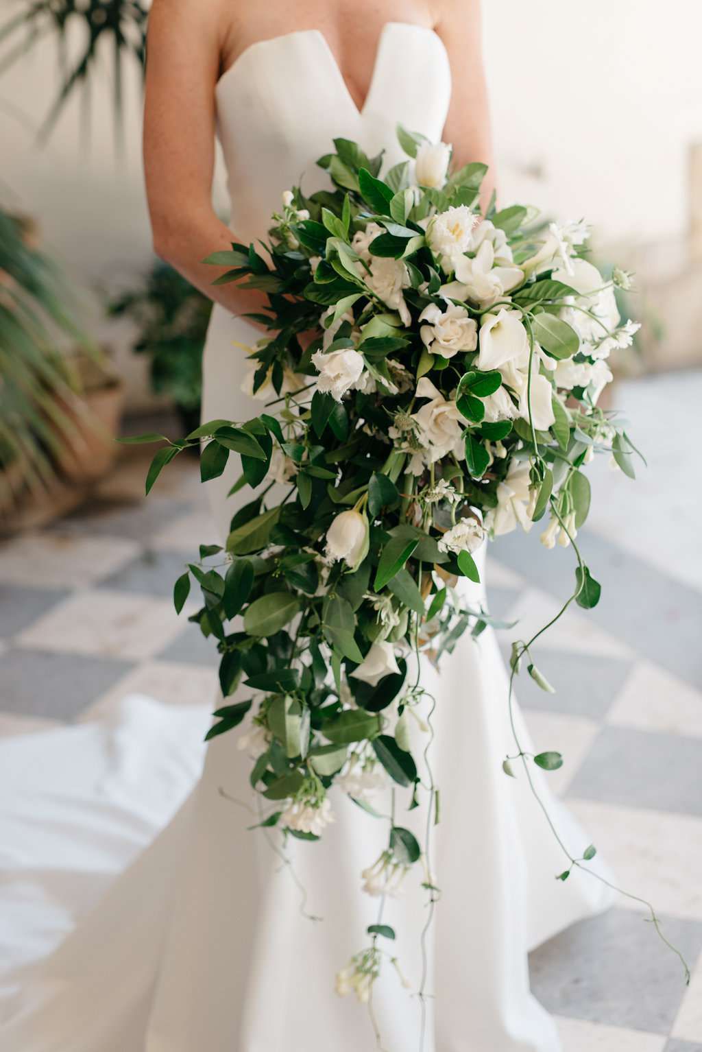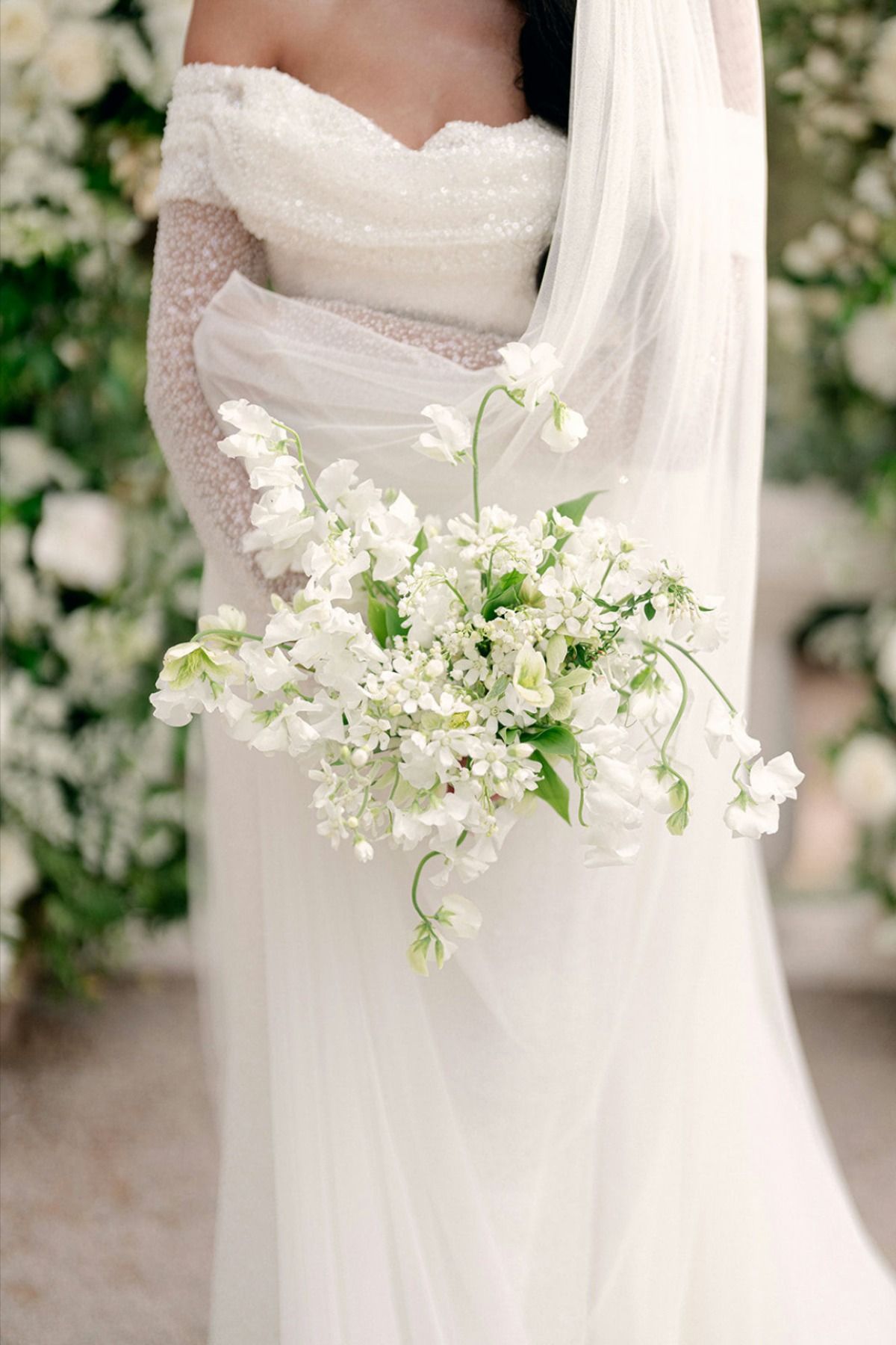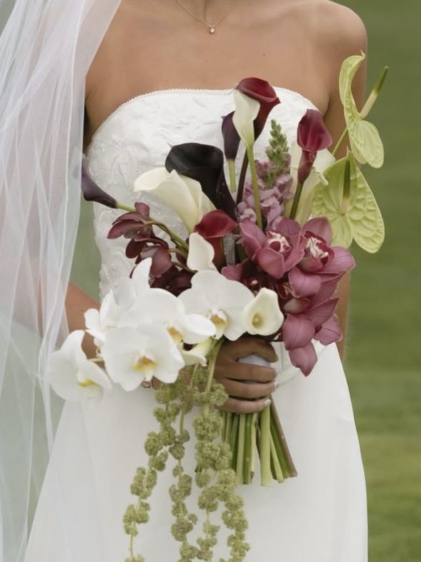 Elegantné kytice s padajúcimi prvkami sa vracajú do módy. Orchidey, amarant alebo splývavá zeleň vytvárajú dramatický efekt a krásny pohyb pri chôdzi nevesty.
